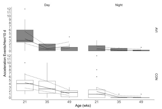 Total acceleration events >20 G sustained per hen over 10 d at each age during day (16 h/d) and night (8 h/day in enriched colony cages (ECC). Hens were reared in either conventional non-enriched cages (CON) or a multi-tiered aviary (AVI) until 19 weeks of age before being moved into ECC. Acceleration events consisted of collision, aggression, grooming, wing-flapping, and mass scattering events. Boxes represent the interquartile range, where the black line represents the median, the top of the box represents the 75th quartile, and the bottom of the box represents the 25th quartile. Whiskers represent the minimum and maximum values, while black dots indicate outliers. The solid line overlaying the box plots is the estimated mean values from the generalized linear mixed effects model, and the dashed lines are the 95% confidence intervals of the estimated means.
