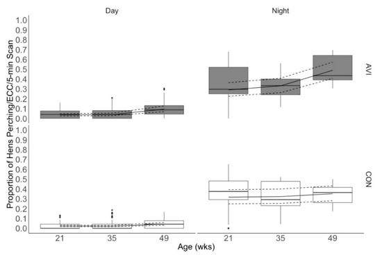 Within each 5-min observation, we calculated the average proportion of hens from each ECC that utilized either of the two perches. The numerator was the total number of hens on the low perch and high perch, and the denominator was the total number of hens in the ECC. The data were analyzed using a zero-inflated beta regression model (glmmTMB package) [22]. The effect of treatment (factor with 2 levels: CON, AVI), age (factor with 3 levels: 21–22, 35–36, and 49–50 weeks), day/night (factor with 2 levels: day, night), and their interactions (treatment × age, treatment × day/night, age × day/night, treatment × age × day/night) were assessed, with day nested in age nested in cage as a random effect.