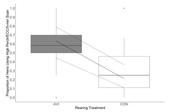 The proportion of perching birds on the high perch by rearing treatment throughout lay (21–49 weeks). Hens were reared in either conventional non-enriched cages (CON) or a multi-tiered aviary (AVI) until 19 weeks of age before being moved into enriched colony cages. Boxes represent the interquartile range, where the black line represents the median, the top of the box represents the 75th quartile, and the bottom of the box represents the 25th quartile. Whiskers represent the minimum and maximum values, while black dots indicate outliers. The solid line overlaying the box plots is the estimated mean values from the generalized linear mixed effects model, and the dashed lines are the 95% confidence intervals of the estimated means.