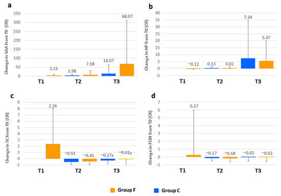 Evolution of (a) serum amyloid A (SAA); (b) haptoglobin (HP); (c) serum cortisol (SC) and (d) fecal cortisol metabolites (FCM) throughout the fattening period of lambs fattened in the feedlot (group F) or on the farm of birth (group C). The results at the different sampling times are expressed as a ratio (RC) representing the change relative to the value measured at the initial sampling (T0) for each animal (RC = Tx − T0/T0). T1 sample was collected on arrival at the feedlot, T2 at the end of the adaptation period (two weeks of fattening) and T3 at the end of the fattening period (six weeks of fattening). Different letters (x, y) at the same sampling time indicate statistically significant differences between the groups (p < 0.05).
