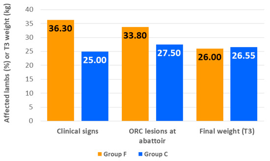 The average weight of the lambs at the beginning of the study was 13.67 ± 2.082 kg. At the end of the fattening, the lambs fattened on the farm of birth weighed on average 0.55 kg more than those fattened in the feedlot (Figure 2), although differences were not statistically significant (26.55 ± 4.026 kg vs. 26.00 ± 3.451 kg; p > 0.05). There were no deaths during the study period but 39 out of the 120 lambs (32.5%) showed clinical signs of illness. The most frequent were apathy and slight fever, non-disease associated (13/39), conjunctivitis (12/39), respiratory signs compatible with ORC (12/39) and diarrhea compatible with coccidiosis (5/39). In all cases, these signs were mild and no lamb needed to be treated. In group F, 29 out of the 80 lambs showed clinical signs and 10/40 in group C. The probability of presenting clinical signs of disease was not affected by the location at which lambs were fattened (Figure 2), although a higher percentage of animals in group F showed clinical signs (36.3% vs. 25.0%, p > 0.05). At abattoir, gross pneumonic lesions compatible with ORC were recognized in 38 of the 120 lambs (31.7%). Again, the finishing location did not affect the probability of finding ORC lesions, although a higher proportion of animals fattened in the feedlot developed them (33.8% vs. 27.5%; p > 0.05) (Figure 2).