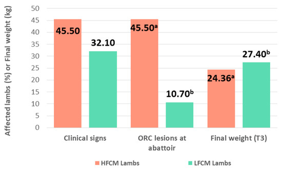 Percentage of lambs with clinical signs of illness throughout the fattening period, percentage of lambs with gross pneumonic lesions compatible with ovine respiratory complex (ORC) identified at the abattoir and average final weight of lambs with concentration of fecal cortisol metabolites at weaning in the highest quartile (HFCM: high fecal cortisol metabolite lambs) and in the lowest quartile (LFCM: low fecal cortisol metabolite lambs). Different letters (a, b) indicate statistically significant differences between the groups (p < 0.05).