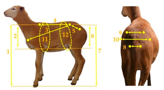 Body measurements taken in hair sheep lambs. (1) height at withers, (2) rib depth, (3) body diagonal length, (4) body length, (5) pelvic girdle length, (6) rump depth, (7) rump height, (8) pin bone width, (9) hook bone width, (10) abdomen width, (11) girth circumference, and (12) abdomen circumference. The lamb used as a reference was 56 days of age and 14.2 kg of live weight.