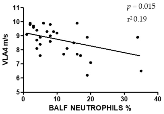 In the literature, some studies report that the percentage of neutrophils increases with age, such as the value of VLA4 [12,25]. However, in our work, we found no of association between age and BALF differential cell count or VLA4. In our work, it is probable that the age range was too small (2–5 years old) to detect any effect of age on these parameters. While it has been reported that sex could have an influence on VLA4 [26], in our sample we did not find any difference for VLA4 related to sex, probably due to the small number of the sample group. In regard to the differential count of BALF, to our knowledge, no association between sex and cell percentage has been reported.