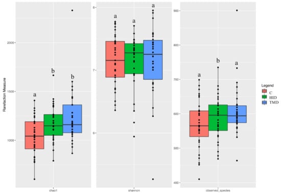Boxplots showing the alpha diversity rarefaction index across fecal samples of rabbits fed with TMD (blue box), HID (green box), or C (red box) diets; C: control diet with soybean oil; HID: diet with Hermetia illucens fat; TMD: diet with Tenebrio molitor fat; Boxes represent the interquartile range (IQR) between the first and third quartile and the line inside represents the median (2nd quartile). Whiskers denote the lowest and the highest values within 1.56 IQR from the first and third quartile, respectively. Different letters in each box indicate significant difference.