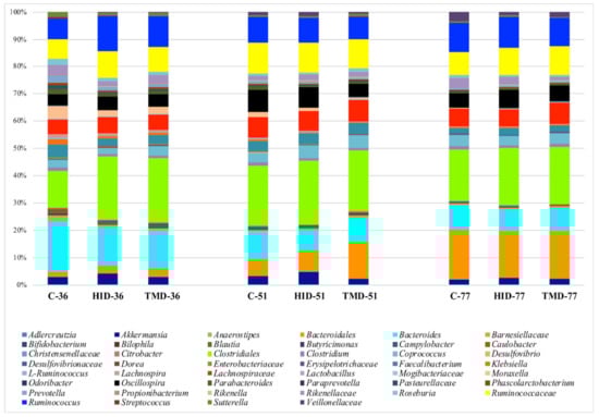 Taxonomic groups detected in fecal samples by means of 16S amplicon target sequencing. Only operational taxonomic units (OTUs) with an incidence above 0.2% in at least two samples are shown. The samples are labelled according to the type of fat supplementation (C: control diet with soybean oil; HID: diet with Hermetia illucens fat; TMD: diet with Tenebrio molitor fat) and sampling time (36, 51, or 77 days).