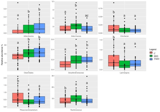 Boxplots showing the relative abundance at genus or family level of the operational taxonomic units (OTUs) differential abundance based on Wilcoxon rank sum test in cecal samples of rabbits fed with TM (blue box), HI (green box), or C (red box) diets. Different letters in each box indicate significant difference; C: control diet with soybean oil; HID: diet with Hermetia illucens fat; TMD: diet with Tenebrio molitor fat.
