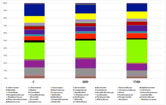 Both HID and TMD increased the relative abundance of Clostridiales (p < 0.01) and Desulfovibrionaceae (p < 0.01), while reducing the relative abundance of Lachnospira (p < 0.05) and Phascolarctobacterium (p < 0.01) when compared to the C diet (Figure 3).