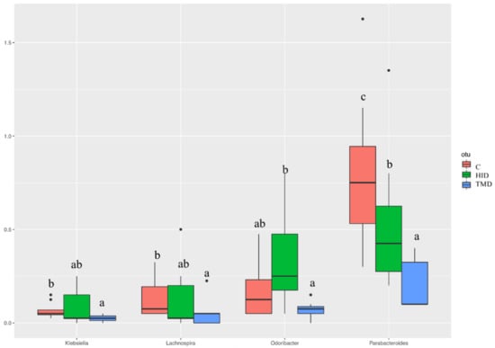 Taking into account the cecal samples (Figure 4), no differences were observed regarding the microbial composition and distribution. However, the pairwise comparisons using the Wilcoxon rank sum test showed that TM inclusion reduced the relative abundance of Klebsiella, Lachnospira, Parabacteroides, and Odoribacter compared to the C and HID (Figure 5, p < 0.05).