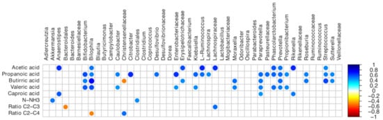 The correlations between VFA contents and microbiota are summarized in Figure 6. In detail, strong positive correlations between Lachnospira and propanoic acid, Akkermansia, Clostridiales, and NH3-N, and Phascolarctobacterium and acetic, propanoic, and caproic acids were detected (p < 0.05).