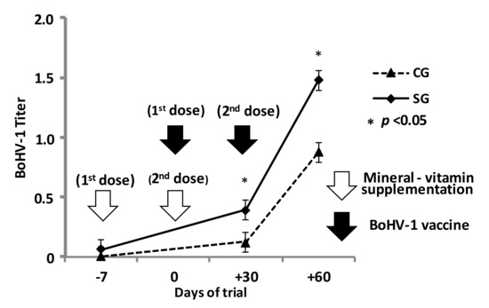- Palomares, R.A.; Hurley, D.J.; Bittar, J.H.J.; Saliki, J.T.; Woolums, A.R.; Moliere, F.; Havenga, L.J.; Norton, N.A.; Clifton, S.J.; Sigmund, A.B.; et al. Effects of injectable trace minerals on humoral and cell-mediated immune responses to Bovine viral diarrhea virus, Bovine herpes virus 1 and Bovine respiratory syncytial virus following administration of a modified-live virus vaccine in dairy calves. Vet. Immunol. Immunopathol. 2016, 178, 88–98. [Google Scholar] [CrossRef]