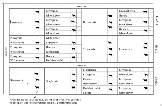 The grazing experiment was carried out from 3 April to 24 April 2019. Thirty-six Jersey multiparous (n = 27) and primiparous (n = 9) cows in mid-lactation were used in a randomized complete block design with 4 pasture treatments (9 cows per treatment) and three replicates (blocks). Nine cows were allocated to each treatment with 3 cows assigned to each replication. Cows were blocked for age (mean ± s.d.; 3 ± 1.3 years), live weight (mean ± s.d.; 492 ± 48.1 kg), and days in milk (mean ± s.d.; 169 ± 63.0 d). Each group of cows contained 1 primiparous and 2 multiparous cows. Dairy cows were offered a dietary treatment of: (1) A mixed, simple pasture; (2) a spatially separated, simple pasture; (3) a mixed, diverse pasture or; (4) a spatially separated, diverse pasture. Each group of 3 cows (2 multiparous and 1 primiparous cows) was randomly assigned to 1 of 12 0.6-ha pasture plots, where they rotationally grazed within the same plot at a stocking rate of 5 cows/ha. During the 21-d grazing period, the first 14 d were used to adjust the cows to the assigned dietary treatments (adaptation period), and the last 7 d were used for experimental measurements. Spatially separated adjacent monocultures in both simple and diverse pastures were grazed commonly by their respective groups of cows, as one pasture at the same time. Cows were strip grazed and allocated an estimated 16 kg of dry matter (DM)/cow per day with a post-grazing residual of 1300 kg of DM/ha. Water troughs were moved as needed to ensure ad libitum access to water. Five days prior to the start of the experiment, cows grazed on a sacrificial tall fescue paddock together as one large group.