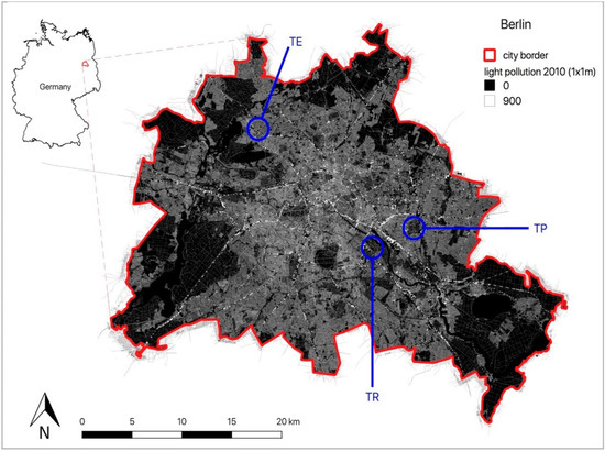 - Kuechly, H.U.; Kyba, C.C.M.; Ruhtz, T.; Lindemann, C.; Wolter, C.; Fischer, J.; Hölker, F. Aerial survey and spatial analysis of sources of light pollution in Berlin, Germany. Remote Sens. Environ. 2012, 126, 39–50. [Google Scholar] [CrossRef]