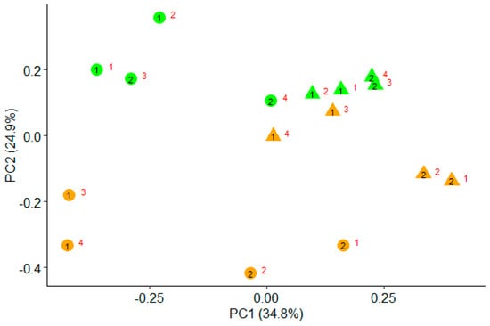 Principal coordinate analysis (PCoA) based on the Bray–Curtis dissimilarities of the automated ribosomal intergenic spacer analysis (ARISA) profiles from liquid (circles) and solid (triangles) phase of fermenters fed a diet containing either extruded maize (green) or dried citrus pulp (orange). Black numbers (1 and 2) correspond to incubation run, and red numbers (1, 2, 3, and 4) to an individual Rusitec fermenter.