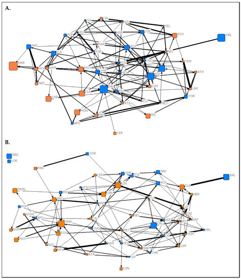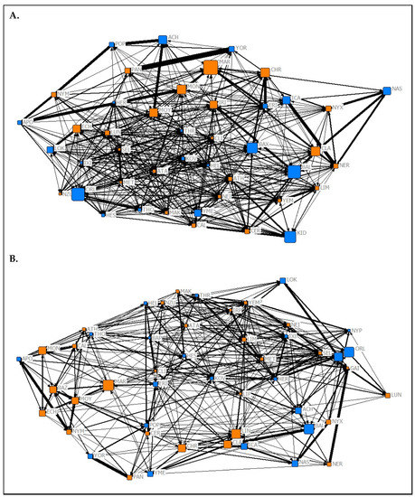 Graphical representations of the observed aggression networks from (A) Summer 2019 and (B) Spring 2020 of captive P. livingstonii. Nodes are labelled with their assigned three letter codes. Blue nodes denote male individuals, and orange denote females. The size of each node corresponds to the age in years of the individual during respective data collection periods with older individuals represented by larger nodes. The width of each tie increases with the weight of the edge. Non-metric geo-distances with node repulsion were used to create the layout, meaning nodes with more similar ties are closer together and nodes that are more central to the network are placed closer to the centre of the graph.