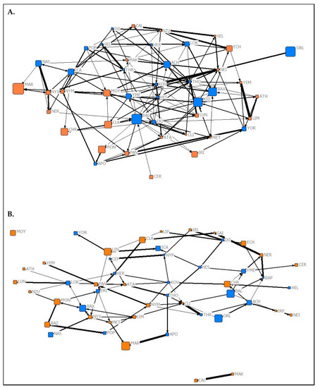 Graphical representations of the observed association networks from (A) Summer 2019 and (B) Spring 2020 of captive P. livingstonii created in the UCINET 6 visualisation tool NetDraw [39]. Nodes are labelled with their assigned three letter codes. Blue nodes denote male individuals, and orange denote females. The size of each node corresponds to the age in years of the individual during respective data collection periods with older individuals being represented by larger nodes. The width of each tie increases with the weight of the edge. Non-metric geo-distances with node repulsion were used to create the layout, meaning nodes with more similar ties are closer together and nodes that are more central to the network are placed closer to the centre of the graph.