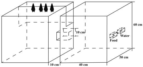 The two connected cages. One cage (the roosting cage), which served as a living environment, was covered with damp towels, while the other cage (the foraging cage) served as a feeding environment. Food and water dishes were used to provide mealworms and water. The two cages were connected by a channel with a length of 10 cm. The bat images in the figure represent only the position of the bats, not the exact number of individuals.
