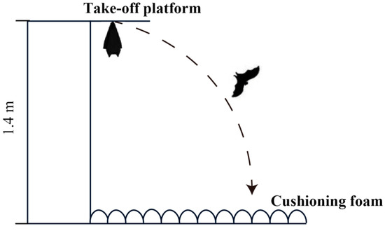 Flying is a very challenging skill, and it has strict requirements for body structure and motor coordination [39]. In addition, two important benchmarks for successful postnatal growth and development in bats are the attainment of flight and independence from parental care [14]. It was observed that the movement patterns of wing flapping and wing spreading in infant Asian parti-coloured bats are the same as the flight patterns in adult bats. To test whether the flapping and spreading behaviours of young bats during development are related to the bat’s first attempt at flight and its ability to successfully fly independently, we designed a flight ability experiment. A previous study has shown that young bats in the wild exhibit flight behaviour at the age of 22 days [37]. According to the developmental patterns (body weight and forearm length) of the bats used in this study, the experiment was conducted before the infants reached 20 days of age. The flight experiment began when the young bats were 17 days old. Mimicking their habitat in the wild, a platform was designed to allow the young bats to hang upside down and was lined with cushioning foam to prevent injuries if they fell (Figure 2). At the start of the experiment, young bats were placed on the take-off platform by researchers and then their behaviours were observed. The young bats would either fly off or stay on the take-off platform. The researchers monitored the positions of the young bats to determine if their behaviour counted as an observation (staying on the take-off platform for more than three minutes counted as an observation). Each young bat was tested for flight ability three times a day before the daily behavioural observations began.