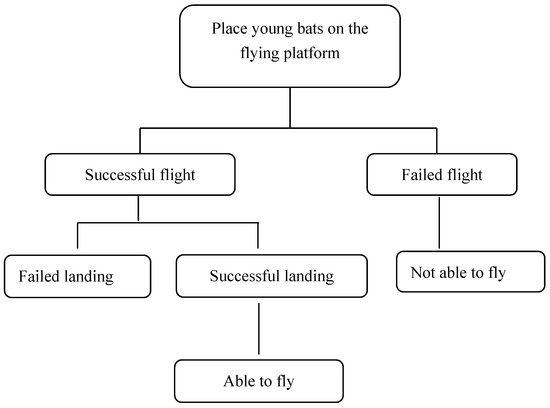 The full behavioural assessment of the young bats was carried out according to the process described in Figure 3. The experiment ended when all the individuals achieved successful flight and a successful landing. The flight performances of the young bats were monitored according to the criteria in Table 1, and the ages of the young bats as they completed each stage were recorded.