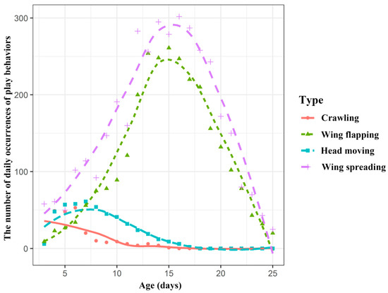 Fitting graph of age and the number of occurrences of wing spreading and flapping behaviours in young Asian parti-coloured bats (Vespertilio sinensis).