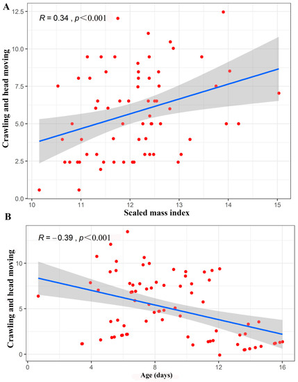 The number of occurrences of the crawling and head moving behaviours was influenced by the scaled mass index (Z = 5.62, p < 0.001), age (Z = −3.62, p < 0.001), and the interaction between scaled mass index and age (Z = −3.62, p < 0.001). When the age of the infants was controlled, there was a significant positive correlation between the scaled mass index and crawling and head moving behaviours (R = 0.34, p <0.001). Furthermore, when the scaled mass index was controlled, there was a significant negative correlation between the age of the infants and crawling and head moving behaviours (R = −0.39, p < 0.001) (Figure 5).