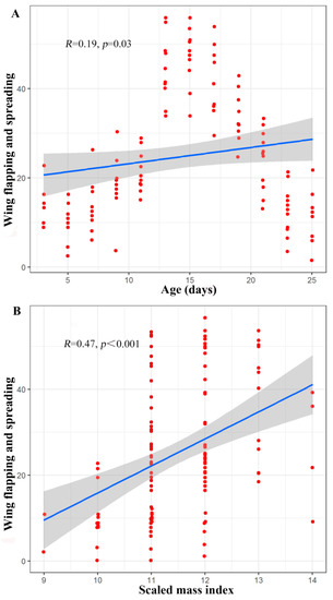The number of occurrences of the wing spreading and flapping behaviours was influenced by the scaled mass index (Z = 4.16, p < 0.001), age (Z = 4.27, p < 0.001), and the interaction between scaled mass index and age (Z = 4.27, p < 0.001). Due to the significant interaction between age and scaled mass index, a partial correlation analysis was performed to control for the interaction between these two factors. When the age of the infants was controlled, there was a significant positive correlation between the scaled mass index and the wing spreading and flapping behaviours (R = 0.47, p < 0.001). Furthermore, when the scaled mass index was controlled, there was a significant positive correlation between the age of the infants and the wing spreading and flapping behaviours (R = 0.19, p = 0.03) (Figure 6).