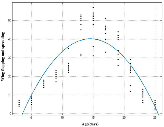 The results of the polynomial analysis showed that the fitted curve equation for the number of wing spreading and flapping behaviours with age was: f(x) = −0.3341x2 + 9.706x − 30.34, (x: age, R2 = 0.75, Adj R2 = 0.74). The number of occurrences of the wing spreading and flapping behaviours in young bats increases and then decreases with age (Figure 7).