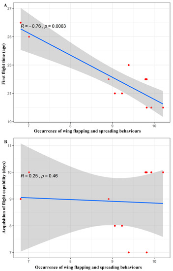 (A) Scatter plot of the correlation between the occurrence of the wing flapping and spreading behaviours and the age at which the young Asian parti-coloured bats (Vespertilio sinensis) performed their first flights. (B) Scatter plot of the correlation between the occurrence of the wing flapping and spreading behaviours and the time at which the ability to fly was acquired. The solid blue lines represent the fitted curves, and the shadowed areas represent the 95% confidence interval.