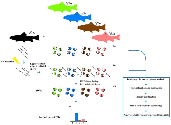 The early stages of vertebrate embryonic development completely rely on the maternal mRNA deposited in the eggs during oogenesis. In fish, maternal mRNA translated upon egg activation governs a series of synchronous cell divisions before the initiation of the zygotic genome activation (ZGA), which usually takes place during mid-blastula transition (MBT) that occurs in rainbow trout 2 days post-fertilization []. Several experiments performed on the model and aquaculture fish species exhibited that maternal gene expression in eggs may be altered by internal and external factors acting during oogenesis and the quality of eggs is paralleled with their transcriptome profiles []. Transcriptomic studies using the next-generation sequencing approach showed that the differences in maternal mRNA abundance in zebrafish eggs were bigger between clutches from different mothers than within the clutches []. In turn, in rainbow trout, greater differences in the maternal gene expression were observed between the eggs from different clutches than between the HHP-treated and untreated eggs from the same clutch []. Both reports indicate that differences in the expression of the maternal genes primarily result from differences between mothers. In the androgenetic and gynogenetic experiments, the differences in survival rates of embryos developing in eggs originating from different females have been reported by several authors [,,], among others. Similar events were also observed in the gynogenetic experiment described here, where significant differences in the survival rates between gynogenetic DH rainbow trout developing in eggs originated from four gamete donors were shown. The eggs of one of the females exhibited great potential for development after activation with UV-treated spermatozoa, manifested by the unusually high survival (>50%) of gynogenetic specimens. As the eggs from other females show several times lower ability for gynogenetic development, it was tempting to assume that the ova showing such a vast differences in potential for gynogenesis may have also had different maternal gene expression profiles. If so, then the comparative trancriptomic analysis of eggs from different clutches exhibiting varied competence for gynogenesis might help to identify the potential genes related to gynogenetic development in rainbow trout. To verify this hypothesis and to find the candidate genes involved in the gynogenetic development in rainbow trout we compared the next generation sequencing data of the maternal mRNA collected from eggs showing varied ability to develop after activation with UV-irradiated spermatozoa (Figure 1). We observed that the number of genes was differentially expressed in the eggs exhibiting increased efficiency for gynogenesis. Genes whose expression was correlated with the improved survival of gynogenetic progenies might be considered as candidate genes for gynogenesis in rainbow trout.