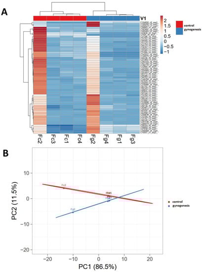 Hierarchical clustering (A) and principal components analysis (B) of the expression of the transcripts that were the most strongly correlated with the efficiency of gynogenesis. Fc1–Fc4–transcripts from the non-activated eggs (control) originated from F1–F4 females, respectively, and Fg1–Fg4–transcripts from gynogenetically activated eggs (gynogenesis) originated from the same females.