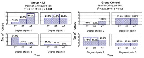 Number (percentage) of horses in groups differing in examination time and degree of pain in the high intensity laser therapy (HILT) group and control (C) group, and the results of the independence test. BT, before treatment (day 0); DT, during treatment (day 13–15); AT, after treatment (day 38–40).