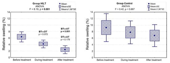 In the control group, the relative swelling systematically decreased, but the differences were not significant (p = 0.667). In group HILT, the relative swelling decreased when comparing the results before and during treatment (6.4 % vs. 4.2%), and this difference was on the border of significance (p = 0.072). At the end of the study, when comparing the results before and after treatment, the difference was significant (6.4% vs. 2.4%; p = 0.001). Additionally, there was a statistically significant difference between group HILT and group C in relative swelling reduction measured during treatment (4.2% vs. 7.8%; p = 0.024) and after treatment (2.4% vs. 6.8%; p = 0.008; Figure 2, Table 2).