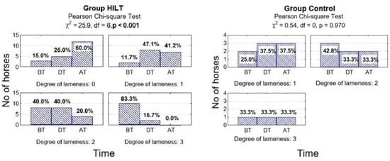 There was no statistically significant difference between the two groups in visual lameness degree during treatment (p = 0.596). After treatment, AAEP scores were significantly lower in group HILT compared with group C (p = 0.044). In addition, at the end of the study there was a statistically significant difference in lameness reduction in group HILT (p < 0.001) but no statistically significant difference in lameness reduction in group C (p = 0.970; Figure 3, Table 1).