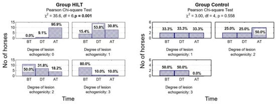 Number (percentage) of horses in groups differing in examination time and lesion echogenicity degree in the HILT group and control group, and the results of the independence test. BT, before treatment (day 0); DT, during treatment (day 13–15); AT, after treatment (day 38–40).
