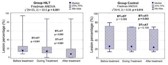 The results of the statistical analysis showed that there was a difference in lesion percentage reduction between the two groups during and after treatment (p = 0.038 and 0.019, respectively; Table 3). Additionally, in group HILT the analysis revealed significant differences in lesion percentage reduction when comparing the results before and during treatment (24.1% vs. 20.7%; p < 0.001), during and after treatment (20.7% vs. 15.7%; p = 0.001) and before and after treatment (24.1% vs. 15.7%; p < 0.001). In the control group, a statistical difference was observed only when comparing the results before and after treatment (39.7% vs. 35.7%; p = 0.043; Figure 5, Table 3).