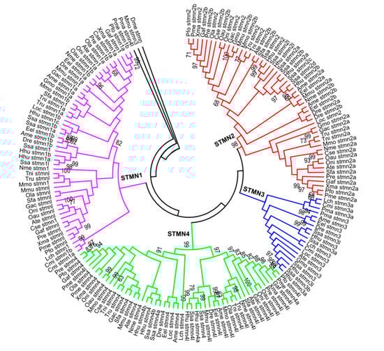 We first identified 175 putative stathmin genes from 27 species of fish (Figure S1), which encode 80–255 residues with pI values ranging from 4.87 to 9.89 (Table S1). All of these predicted stathmin proteins were significantly hydrophobic. Most of them were located in the cytoplasm or nucleus predicted by CELLO [29]. To elucidate the phylogenetic relationship of the stathmin family genes in the 27 species of fish, NJ and ML evolutionary trees were constructed. Notably, a very similar topology was found between them (Figure 1 and Figure S2). Here, the NJ tree was used for further analysis (Figure 1). Most of the stathmin members were divided into four groups (STMN1, STMN2, STMN3, and STMN4) based on the phylogeny and sequence similarity (Figure 1). This is consistent with the previous classification [6,7]. The evolutionary relationship of Mmu_stmn3 and Pma_stmn4l is far away from other members and is not clustered in any group. They will not be further analyzed in this study. STMN1 and STMN2 groups contain the maximum number of 52 members, representing over 29.7% of the total number, while the STMN3 group only contains 19 members. Moreover, we also found that some stathmin genes were distributed in tandem in the genomes of S. salar, H. hucho, and others, which indicated that tandem duplication accelerated the amplification of stathmin genes in these fish species (Table S1).