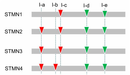Exon–Intron organization of the stathmin genes in different groups. The inverted triangles with green and red marks indicate the insertion positions of phase 0 and 1 introns, respectively. Five conserved introns (I-a, I-b, I-c, I-d, and I-e) were also named and marked.