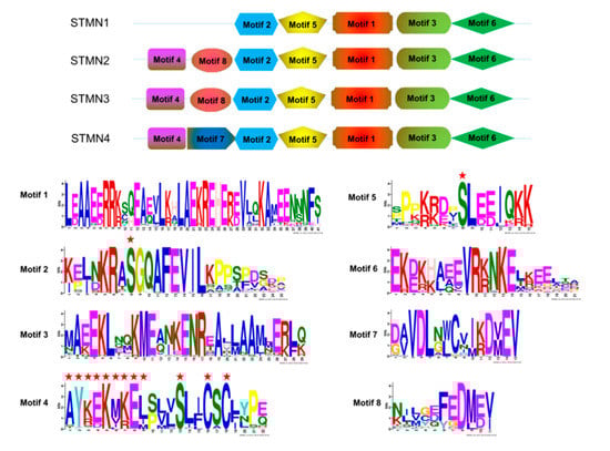 Next, MEME [32] was used to compare their structural diversity. Eight conserved motifs were found among them (Figure 3). Generally speaking, most members of each group have the same motif, indicating their functional similarity [38,41]. In addition, some group-specific motifs were also found. For instance, motif 7 was specific for the STMN4 group. In the N-terminal extension, a consensus sequence (AYKEMKEL) and two conserved cysteine residues were found in motif 4, which could be palmitosylated to facilitate stathmin recruitment to Golgi. Mutations at these two sites significantly reduced stathmin’s ability to be recruited into Golgi apparatus [12]. Moreover, some conserved serine residues were also found in motif 2, motif 4, and motif 5. Phosphorylation of these serine sites reduces stathmin’s ability to depolymerize microtubules [4,11]. By converting these serine residues into alanine residues, stathmin’s depolymerization activity was enhanced [12]. Therefore, these specific regions or sites play important roles in the functional properties of stathmin members.