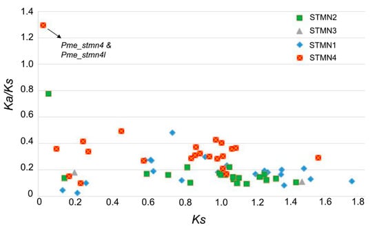 Gene duplication is an important factor in promoting the complexity of organisms. Duplicated genes usually undergo different evolutionary fates, such as pseudogenetization, subfunctionalization, and neofunctionalization [42]. In the process of evolution, duplicated genes face different selection pressures, which are represented by two parameters: Ka and Ks. To explore the divergence of duplicated stathmin genes, their selective pressure was investigated. A total of 23, 22, 3, and 22 pairs of duplicated stathmins were found in STMN1, STMN2, STMN3, and STMN4, respectively. The results indicated that most duplicated stathmins were subjected to purifying selection (Figure 4). Only one pair of genes (Pme_stmn4 and Pme_stmn4l) had a Ka/Ks value above 1, indicating that they were under selective pressure. Sequence analysis indicated that, compared with the Pme_stmn4 gene, one segment (motif 6) was inserted into the 3` end of the Pme_stmn4l gene, which led to further divergence between them. Although the function of motif 6 needs further study, these duplicated genes may provide new genetic material for organisms to cope with environmental changes.