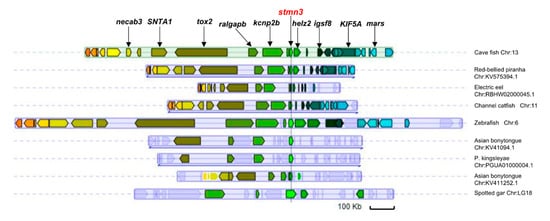 Synteny refers to the conservative evolutionary relationship between genome regions, which provides a framework for inferring the common ancestor of genes [43,44]. Thus, synteny analysis is an important tool to study gene function and evolution. The stmn3 gene of cave fish (Ame_stmn3, ENSAMXG00000017478.2) was used to carry out the synteny analysis in the Genomicus database v78 [35]. The results indicated that some loci near stmn3 showed conserved synteny in some fish (Figure 5). In addition, some gene deletions or insertions were also found in the neighboring regions of stmn3 in some fish. For example, compared with the cave fish, some genes (tox2, SNTA1, KIF5A, etc.) near stmn3 were lost in the spotted gar, suggesting a distant evolutionary relationship between them.