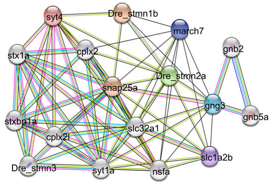 STRING database [36], based on prediction and experimental analysis, was used to construct a protein interaction network to explore which members might interact with stathmin. The network showed 74 interactions between three stathmins and 14 other genes (Figure 6). Some membrane-associated RING-CH protein 7 (march7), N-ethylmaleimide sensitive factor (nsf), synatotagmin (syt), syntaxin (stx), and 25 kDa synaptosome-associated protein (snap25) were predicted as the main interactors of stathmins. March7 belongs to a family of ubiquitin E3 ligase, which is involved in the neuronal development and T cell proliferation [45,46] Nsf is a necessary ATPase for membrane fusion. Zebrafish nsf mutants exhibited significant neuropeptide protein accumulation, synaptic transmission, and nerve activity disorder [47,48]. Therefore, nsf plays a key role in the nervous system. It promotes the proper fusion of synaptic vesicles and enables neurons to communicate through chemical synapses [49]. Synaptic transmission is a basic biological process to maintain neuronal communication. Syt is a major Ca2+ sensor that activates vesicular exocytosis and releases presynaptic neurotransmitters [50]. The release of glutamate from neurons in syt knock-out mice decreased significantly, suggesting that the release of presynaptic neurotransmitters plays an important function [51]. Stx regulates exocytosis, membrane fusion, and the docking of secretory particles on the plasma membrane [52]. Snap25 is a presynaptic membrane protein specifically expressed in neuron cells [53]. It is involved in many biological processes, such as neural signal transduction, axon growth, neurotransmitter release, etc. [54]. In this study, we found that these proteins were predicted to interact with stathmins (Figure 6). This suggests that stathmins may be involved in the process of neurotransmission and development. In addition, complexin-2 (cplx2), G-proteins (gnb2 and gng3), and solute carrier family proteins (slc1a2b and slc32a1) were also found in the network (Figure 6), suggesting that stathmins may play roles in a variety of physiological processes.