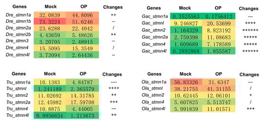 Pesticides widely interfere with many physiological processes of aquatic organisms [55]. In this study, the expression profiles of stathmin genes under dimethoate stress were investigated by RNA-seq. The results indicated that compared with the mock group, 54.2% and 29.2% of stathmin genes were up-regulated and down-regulated under dimethoate stress, respectively (Figure 7). Among them, the expression level of Gac_stmn2 and Gac_stmn4l genes were increased by 7.1 and 6.4 times, respectively, under this treatment. Previous studies have indicated that stathmins play an important role in the development and regeneration of the nervous system by mediating the growth and branching of axons [12,13,56]. Moreover, dieldrin, an organochlorine pesticide, can induce neurotoxicity in fish by altering the expression level of some proteins including stathmin 1a [57]. Here, our study also indicated that dimethoate changed the transcriptional level of most stathmin, implying potential neurotoxic effects on fish. In addition, the expression patterns of several duplicated stathmins, such as Dre_stmn1a and Dre_stmn1b; Tru_stmn1a and Tru_stmnl; Gac_stmn4 and Gac_stmn4l and so on, were also investigated. The results indicated that their expression patterns were different under dimethoate stress (Figure 7). It suggests that these genes have different expression profiles after duplication, which is helpful for organisms to adapt to the changing environment in evolution.