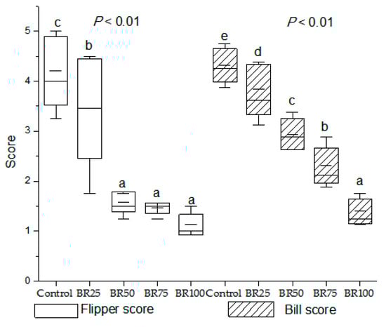 A one-way ANOVA showed that there were effects of dietary BR concentrations on bare skin color score of the flipper (p < 0.01) and bill (p < 0.01) (Figure 1). The higher the color score is, the more yellow the bare skin color; otherwise, the paler the color. The control and BR25 groups had a higher flipper score than the BR50, BR75 and BR100 groups (p < 0.01); and the control group had a higher flipper score than the BR25 group (p < 0.05). Broken rice had a significant effect on bill scoring (p < 0.01).