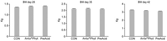 The effect of the dietary treatments on the body weight (BW) of chickens at days 28, 35 and 42 of age. Birds were fed a control diet (CON); the control diet supplemented (on top) with phytogenic ingredients from hops, licorice and arabic gum (Anta®Phyt); or a diet supplemented with a mixture of a free butyrate acidifier and prebiotic gluconic acid (PreAcid). Data are the means ± SEMs of 12 replicates per treatment. Differences between groups were considered significant when p < 0.05.
