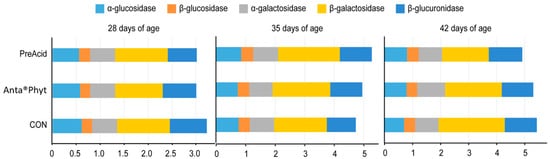 The effect of dietary treatments on the bacterial enzyme activities (μmol/h/g) in the cecal digesta of chickens at days 28, 35 and 42 of age. Birds were fed a control diet (CON); the control diet supplemented (on top) with phytogenic ingredients from hops, licorice and arabic gum (Anta®Phyt); or a diet supplemented with a mixture of a free butyrate acidifier and prebiotic gluconic acid (PreAcid). Data are the means of 12 replicates per treatment. Differences between groups were considered significant when p < 0.05.
