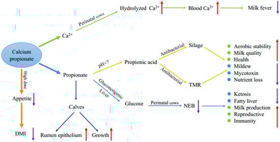 Propionic acid and Ca2+ are basic components in the rumen fluid [], which means that calcium propionate is safe to add to the feed of dairy cows. It is approved by the World Health Organization (WHO) and the United Nations Food and Agriculture Organization (FAO) for use in food or feed additives. Therefore, it is used as a safe and valuable additive in the dairy cow industry. To update our knowledge on calcium propionate application for dairy cow performance and metabolism, we reviewed the effects of calcium propionate supplementation on decreasing feed mycotoxins, alleviating dairy cow NEB and milk fever, and promoting rumen development in dairy calves.