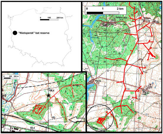 Międzyrzecz Fortified Front (Ostwall or Festungsfront im Oder-Warthe Bogen) situated in Western Poland (52°25′ N, 15°32′ E) is a massive subterrain fortification complex built by the Germans in 1934–1944. Its Central Sector “Wysoka” (Zentralabschnitt or Abschnitt Hochwalde), where the observations were carried out, includes a system of concrete tunnels with a total length of approximately 32 km situated 20–30 m in the underground. The axis of the underground system called the “main road” is connected to the smaller side corridors leading to aboveground bunkers (Panzerwerk), that are access points for bats into the underground system. The “Nietoperek” bat reserve situated in Central Sector “Wysoka” is ranked among the top 10 largest hibernation sites in the European Union. The number of hibernating bats exceeds 39,000 individuals in some years. In 2007 the whole underground system with the surrounding surface area of 7377.37 ha became protected as Natura 2000 site “Nietoperek” (area code: PLH080003). Out of 12 bat species found hibernating in the “Nietoperek”, four are mentioned in Annex II of the EU Habitat Directive. More detailed descriptions of the “Nietoperek” bat reserve is given in our previous publications [9,42,43].