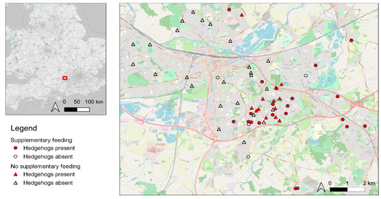 Volunteers (citizen scientists) were recruited through an advert on social media in October 2017. Interested participants were asked to provide information on their garden location, current hedgehog-feeding habits, and, to the best of their knowledge, the frequency with which hedgehogs used their garden (ranging from “never” to “every night”). This information was used to categorise volunteers as those who were feeding hedgehogs prior to the start of the study itself (and, by default, who had hedgehogs in their garden), those who were not feeding hedgehogs at this time but who had them visiting their garden, and those who were not feeding hedgehogs at this time and who did not think they visited their garden. As we were interested in investigating the patterns of behaviour of hedgehogs in relation to the existing pattern of feeding by householders (i.e., this was an observational study), and because we were reliant on members of the public agreeing to participate, the distribution of households relative to one another and garden size were dependent on the volunteers themselves; these issues are considered further below.