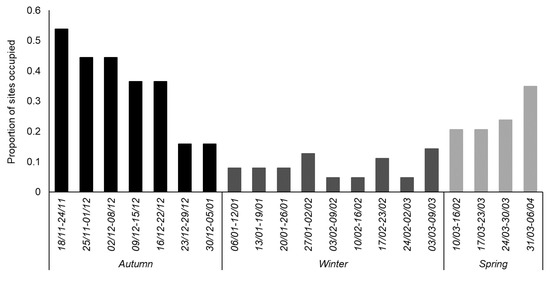 The cut-off dates encompassing each season were informed by the pattern of occupancy observed during the 20-week survey. When ≤15% sites were occupied each week, the majority of hedgehogs were considered to be inactive and any data collected during that time were allocated to the winter category. Thus, the three time periods were identified as Weeks 1–7 (18 November 2017–05 January 2018), Weeks 8–16 (06 January 2018–09 March 2018), and Weeks 17–20 (10 March 2018–06 April 2018). Although we concede that this is an a posteriori approach to defining the hibernation period, the timing of low occupancy is in line with that reported elsewhere for hibernation in Britain at this latitude [7,10,21]. Analyses were, however, also conducted with an alternative cut-off threshold (≤20% sites occupied, Weeks 6–16) to investigate the consistency of the occupancy models; no marked differences in the results were evident (see Supplementary Table S1).