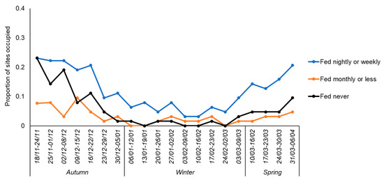 Overall, 63 householders completed the study (Figure 1). During Week 1, results were obtained for 26 (41.2%) sites as compared with 100% in subsequent weeks; this was associated with the challenges of getting volunteers started but is not likely to have affected the results since occupancy analysis is robust to missing data [67]. In autumn, or ”pre-hibernation”, hedgehogs were and were not being fed in 25 (39.7%) and 38 (60.3%) gardens, respectively (Figure 1).